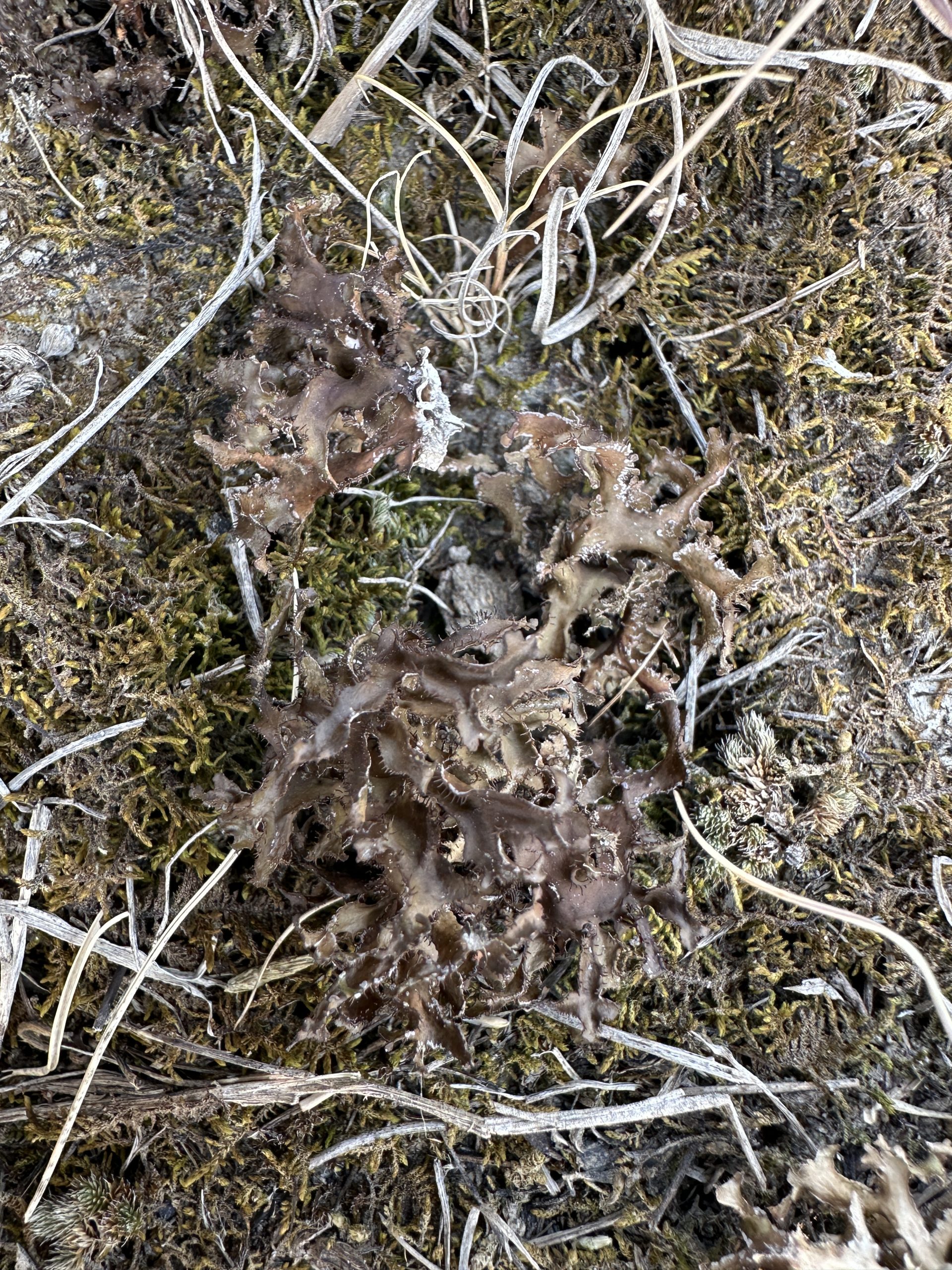 Cetraria islandica: color also either more reddish or paler, larger lobed, pseudocyphellae mainly laminal, pycnidial projections rounded at the tip, medulla PD+ red (fumarprotocetraric acid); restricted to the foothills and montane regions of Alberta. |