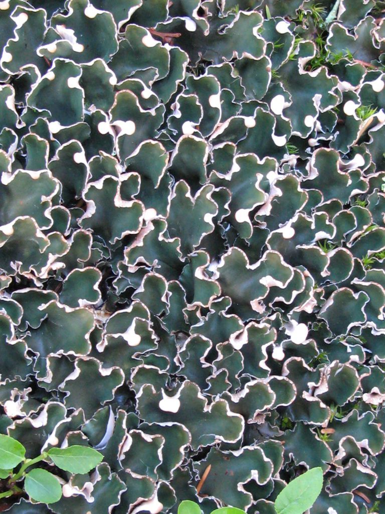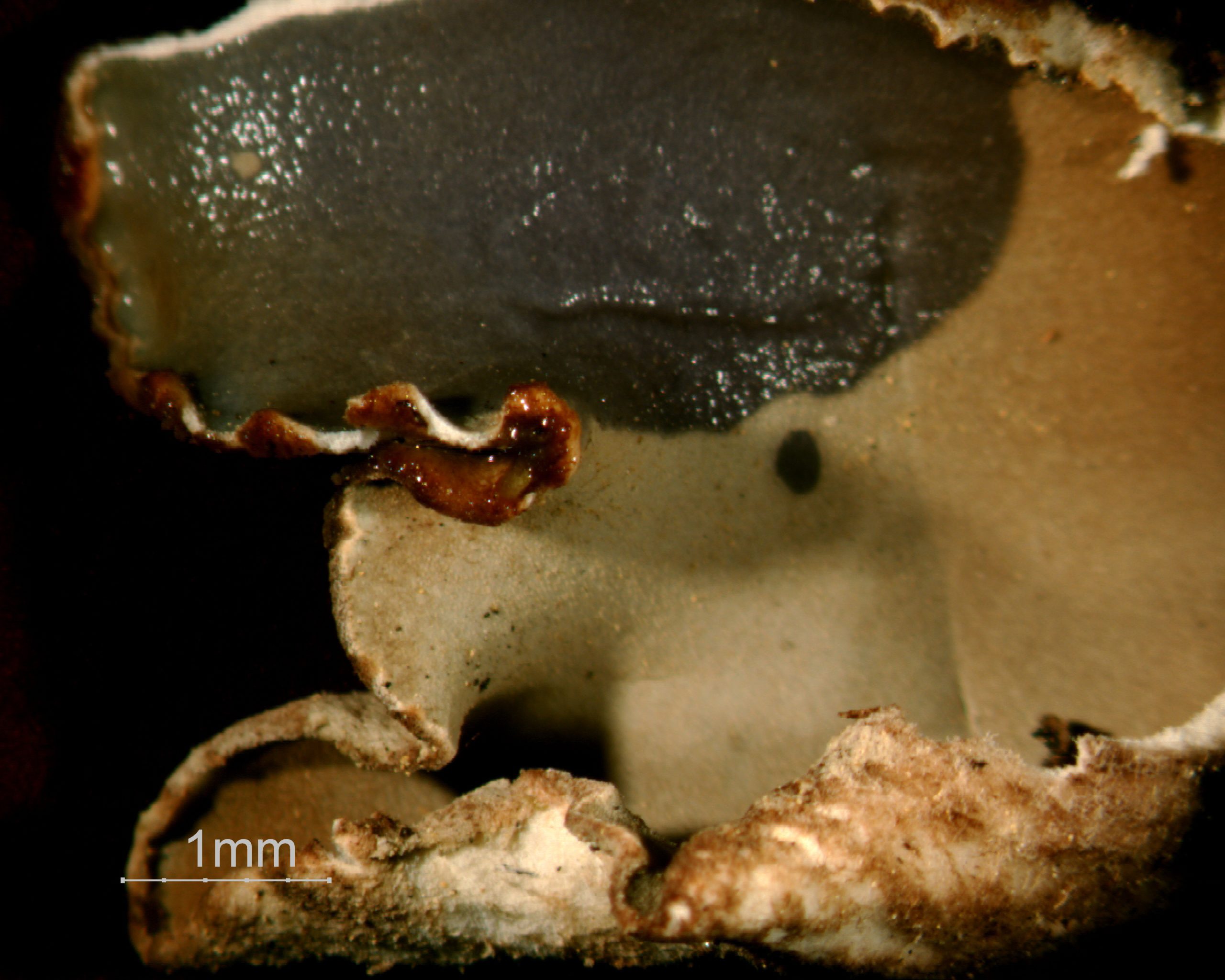 | Field Characters | Large leafy bipartite cyanolichens. Thalli to 15 cm across, composed of individual lobes ascending and overlapping, sometimes covering > 1 m square. Lobes 1-3 cm wide, relatively thick, and branching sparingly but regularly. Upper surface plane with upturned lobe tips, grey to greenish-brown when dry, blue-grey to dark forest green when wet. Often with sparse erect tomentum on the lobe tips and sometimes pruina, but otherwise upper cortex smooth. Lower cortex lacking, lower surface typically lacking veins or with indistinct, broad veins. Rhizines sparse. Apothecia red-brown, saddle-shaped, rare. Vegetative propagules lacking. When dry the thallus is stick and cardboard-like. |