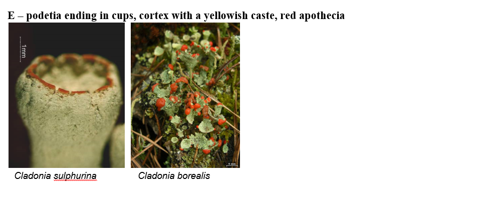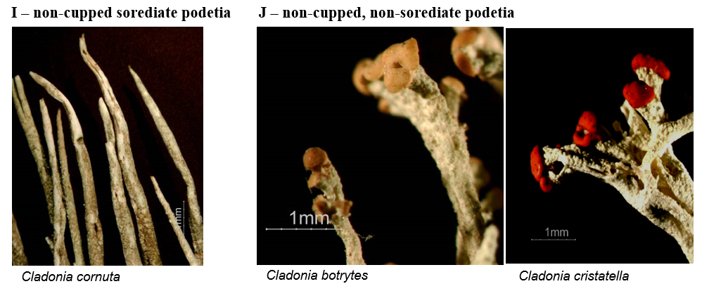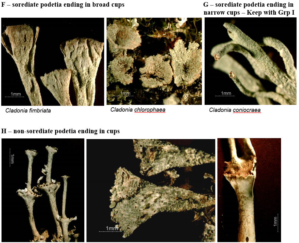 TIP: It is easy to get overwhelmed with Cladonia. Species almost always grow intermixed. Be very careful in picking out one morphogroup of Cladonia in a mixed colony to key out. Use your evolved pattern-finding brain, and trust it when it tells you that two things are different; key out one at a time; build experience from there.