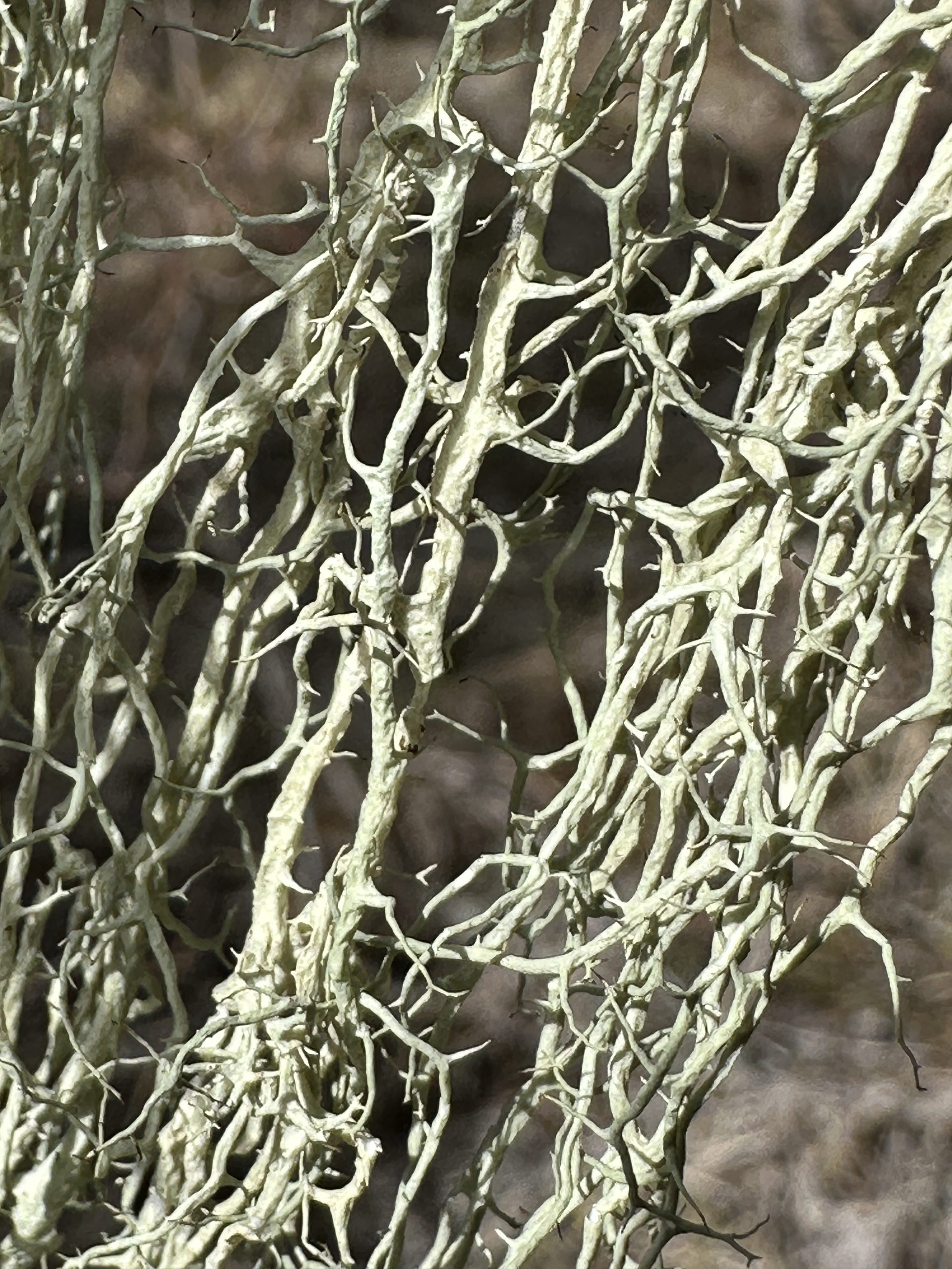 3b. Thallus pendant, epiphytic, more rarely prostrate on soil in the mountains; branches soft-corticate, supple; medulla lax (epiphytic) or dense (terricolous)…..Evernia divaricata