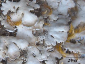 | Field Characters | Small to medium sized leafy chlorolichens. Pale, loosely appressed to ascending thalli with lobes that often broaden near the lobe tips. Heterodermia gets its name from its unusual cortical tissues. The hyphae are aligned parallel to the lobe, giving the upper cortex a “combed” or “flowing” appearance. Besides being finely striate, the upper cortex is typically dull, milky white to greenish white to browned. The lower cortex is white or in some species absent. Soralia are common and the placement can be used to distinguish species, varing from marginal to terminal in hooded or labriform lobe tips. Apothecia rare in Alberta species, common in some species elsewhere. The margins are commonly ciliate (but sometimes the cilia are referred to as rhizines, depending on the author). The important thing is that these cilia vary from simple to squarrose branched to thyrisiform (branching three or more times) and those differences are important taxonomically. These are the structures that give these species the common name of Centipede Lichens. There is still more to learned about the taxonomy of this species in Alberta, and if in doubt, don’t limit yourself to these species, see Lendemer 2009. | |