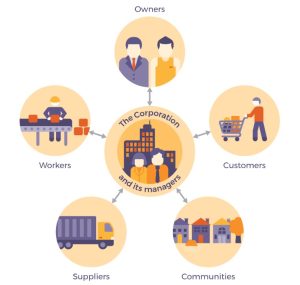 While the Pyramid of Social Responsibility is a well-respected resource for situating corporate social responsibility, another view of corporate social responsibility is from the perspective of a company’s relationships with its stakeholders. In this model, the focus is on managers—not owners—as the principals involved in these relationships. Owners are the stakeholders who invest risk capital in the firm in expectation of a financial return. Other stakeholders include employees, suppliers, and the communities in which the firm does business. Proponents of this model hold that customers, who provide the firm with revenue, have a special claim on managers’ attention. The arrows indicate the two-way nature of corporation-stakeholder relationships. All stakeholders have some claim on the firm’s resources and returns, and management’s job is to make decisions that balance these claims. [3]