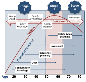 At each stage, there are recommended changes in the focus of the individual’s financial planning: