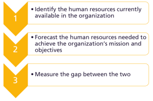 Once they’ve analyzed the jobs within the organization, HR managers must forecast future hiring (or firing) needs. This is the three-step process summarized below: