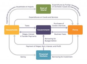The globalization of business is bound to affect you. Not only will you buy products manufactured overseas, but it’s likely that you’ll meet and work with individuals from various countries and cultures as customers, suppliers, colleagues, employees, or employers. The bottom line is that the globalization of world commerce has an impact on all of us ~ as evidenced in the figure below, The Expanded Circular Flow Model. Therefore, it makes sense to learn more about how globalization works.