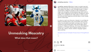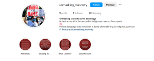 In Unmasking Mascotry, I argue against the use of Indigenous stereotypes, culture, and imagery in the context of sports mascots and fandom. In the history of professional and amateur sports, many teams have adopted racist and derogatory team names and associated mascots. These derogatory images are dangerous because they create a singular, stereotypical, and racist narrative of what is Indigenous. It removes the diversity in Indigenous peoples and culture, and simplifies them all to a singular image. In this Instagram activism account, I argue against the use of these mascots and images for various important reasons, but I also highlight the current efforts that are ongoing.
