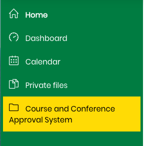 To start a new application go to the left side navigation bar and click on “Course and Conference Approval System”